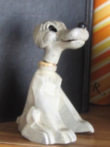 Also while in New Jersey, this time antiquing in Point Pleasant, Peter saw this small Pluto-like dog. The dog’s head wobbled so he was like a canine bobble head. Where else? The dashboard of the car. By now the car is housing, a Construction Worker, Donald Duck, a Sailor and a not so small dog! Besides a wobbly neck the dog’s mouth opens too!